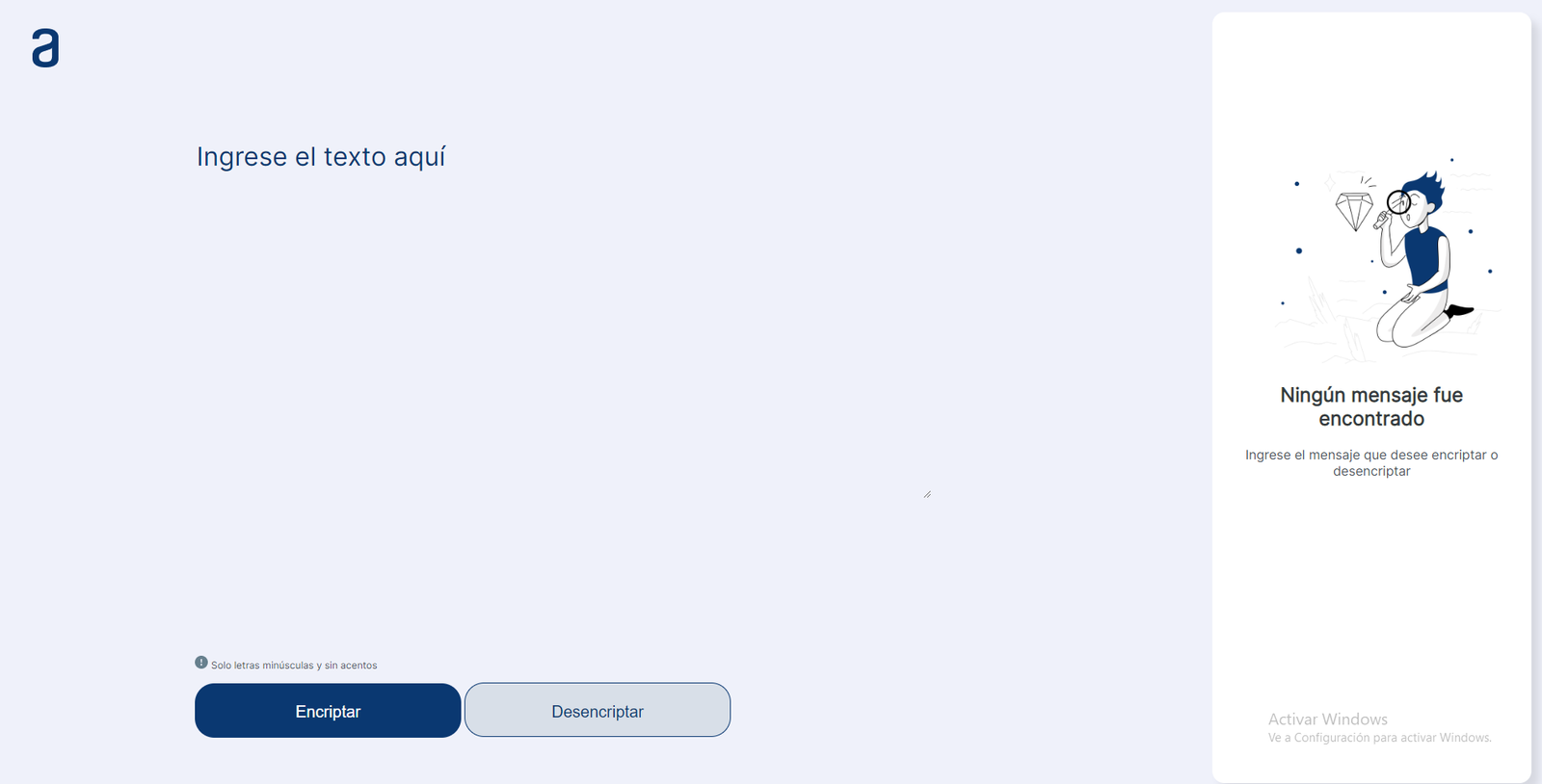 Trabajo práctico evaluativo del programa de desarrollo Oracle Next Education. Desarrollé un encriptador de texto que permite codificar y decodificar mensajes utilizando HTML, CSS y JavaScript. La interfaz es minimalista y amigable, enfocada en funcionalidad y diseño intuitivo.